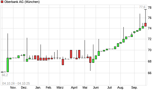 Mit dem Anstieg auf 75,00 EUR hat die Oberbank-Aktie (ISIN AT0000625108) am 03.10.2025 ein neues 12-Monats-Hoch erreicht und damit den Kurs vom 23.09.2025 eingestellt.Die Oberbank-Aktie befindet ...weiterlesen