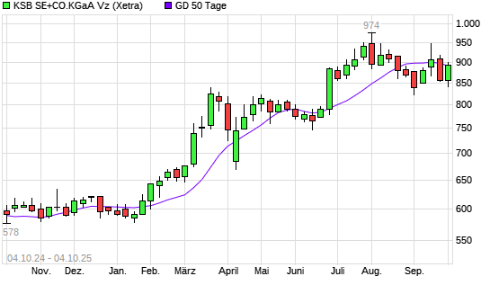 Mit dem Anstieg auf 888,00 EUR hat die KSB Vz-Aktie am 03.10.2025 die 50-Tage-Linie nach oben gekreuzt.Die KSB Vz-Aktie befindet sich seit dem 29.01.2025 im langfristigen Aufwärtstrend und hat ...weiterlesen