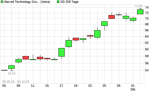Mit dem Anstieg auf 74,00 EUR hat die Marvell Technlogy Group-Aktie am 02.10.2025 die 200-Tage-Linie nach oben gekreuzt.Die Marvell Technlogy Group-Aktie befand sich seit dem 26.09.2025 im langfristigen ...weiterlesen