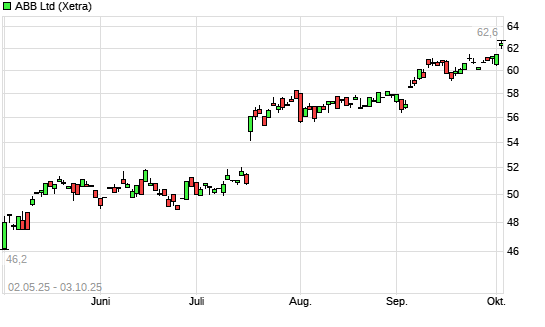 Mit dem Anstieg auf 61,44 EUR hat die ABB-Aktie (ISIN CH0012221716) am 02.10.2025 ein neues All-Time-High erreicht und damit den Kurs vom 10.09.2025 eingestellt.