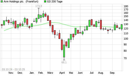 Mit dem Anstieg auf 130,20 EUR hat die ARM Holdings-Aktie am 02.10.2025 die 200-Tage-Linie nach oben gekreuzt.