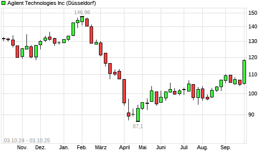 Mit dem Anstieg auf 118,24 EUR hat die Agilent Technologies-Aktie (ISIN US00846U1016) am 02.10.2025 ein neues 6-Monats-Hoch erreicht und damit den Kurs vom 01.10.2025 eingestellt.