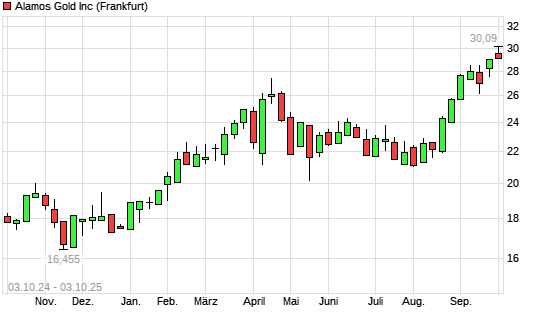 Mit dem Anstieg auf 29,98 EUR hat die Alamos Gold-Aktie (ISIN CA0115321089) am 02.10.2025 ein neues All-Time-High erreicht und damit den Kurs vom 01.10.2025 eingestellt.