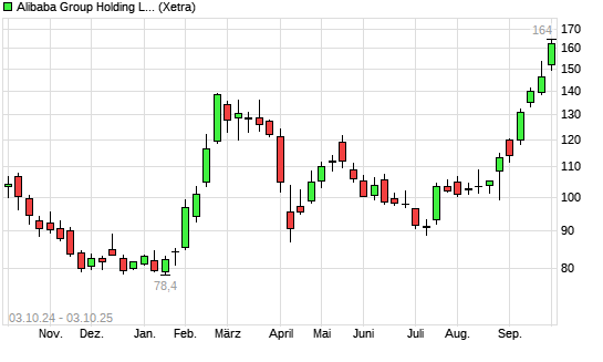 Mit dem Anstieg auf 161,20 EUR hat die Alibaba-Aktie (ISIN US01609W1027) am 02.10.2025 ein neues 3-Jahres-Hoch erreicht und damit den Kurs vom 01.10.2025 eingestellt.