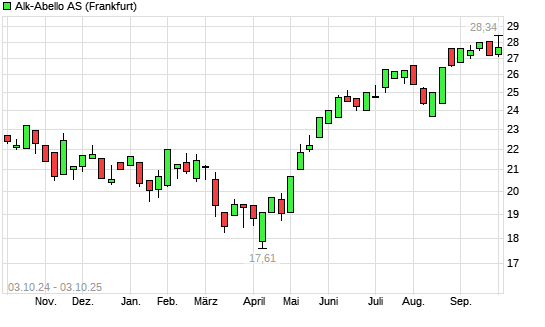 Mit dem Anstieg auf 28,34 EUR hat die Alk Abello-Aktie (ISIN DK0061802139) am 02.10.2025 ein neues All-Time-High erreicht und damit den Kurs vom 22.09.2025 eingestellt.