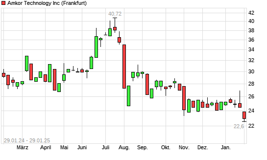 Mit dem Rücksetzer auf 23,15 EUR hat die Amkor-Aktie (ISIN US0316521006) am 28.01.2025 ein neues 12-Monats-Tief erreicht und damit den Kurs vom 05.11.2024 eingestellt.