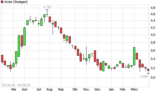 Mit dem Rücksetzer auf 3,10 EUR hat die Arise-Aktie (ISIN SE0002095604) am 01.04.2025 ein neues 6-Monats-Tief erreicht und damit den Kurs vom 14.03.2025 eingestellt.