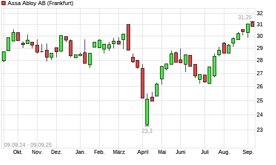 Mit dem Anstieg auf 31,19 EUR hat die Assa Abloy AB B-Aktie (ISIN SE0007100581) am 08.09.2025 ein neues All-Time-High erreicht und damit den Kurs vom 05.09.2025 eingestellt.