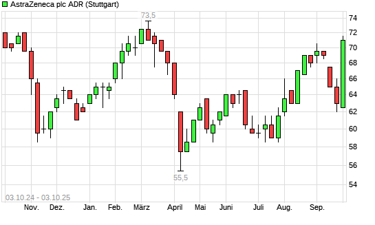 Mit dem Anstieg auf 70,50 EUR hat die Astrazeneca ADR-Aktie (ISIN US0463531089) am 02.10.2025 ein neues 6-Monats-Hoch erreicht und damit den Kurs vom 05.09.2025 eingestellt.