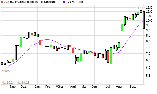 Mit dem Rücksetzer auf 9,34 EUR hat die Aurinia Pharmaceuticals-Aktie am 30.09.2025 die 50-Tage-Linie nach unten gekreuzt.