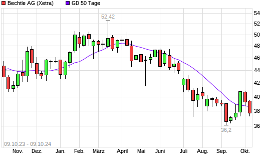 Mit dem Rücksetzer auf 38,60 EUR hat die Bechtle-Aktie am 08.10.2024 die 50-Tage-Linie nach unten gekreuzt.