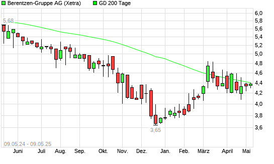 Mit dem Rücksetzer auf 4,31 EUR hat die Berentzen-Aktie am 08.05.2025 die 200-Tage-Linie nach unten gekreuzt.
