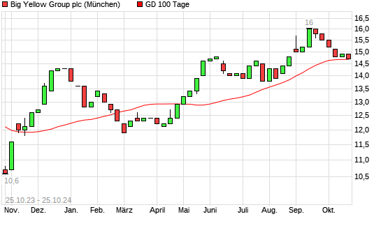 Mit dem Rücksetzer auf 14,20 EUR hat die Big Yellow Group-Aktie am 24.10.2024 die 100-Tage-Linie nach unten gekreuzt.