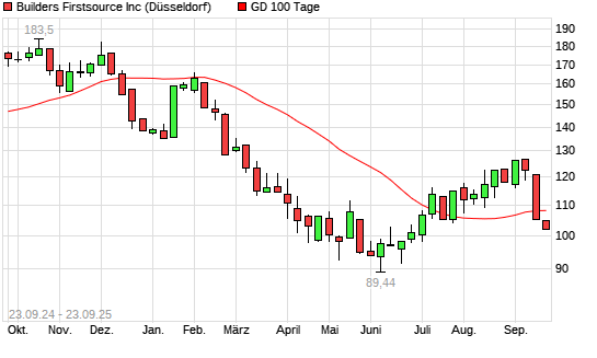 Mit dem Rücksetzer auf 104,85 EUR hat die Builders Firstsource-Aktie am 22.09.2025 die 100-Tage-Linie nach unten gekreuzt.
