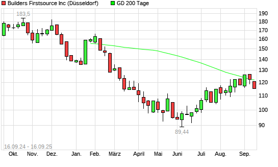 Mit dem Rücksetzer auf 118,35 EUR hat die Builders Firstsource-Aktie am 15.09.2025 die 200-Tage-Linie nach unten gekreuzt.