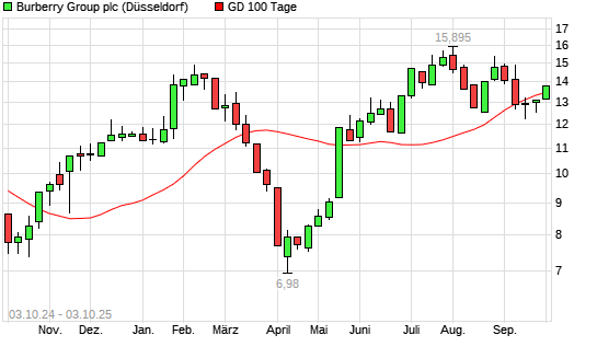 Mit dem Anstieg auf 13,56 EUR hat die Burberry Group-Aktie am 02.10.2025 die 100-Tage-Linie nach oben gekreuzt.