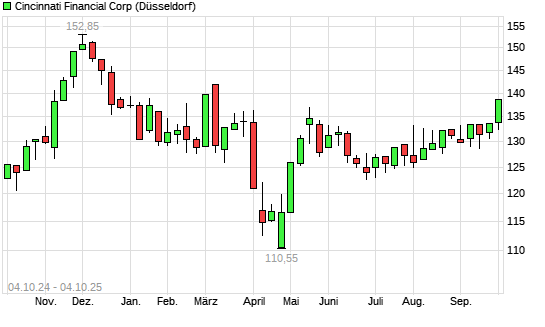 Mit dem Anstieg auf 136,85 EUR hat die Cincinnati Financial-Aktie (ISIN US1720621010) am 03.10.2025 ein neues 6-Monats-Hoch erreicht und damit den Kurs vom 02.10.2025 eingestellt.