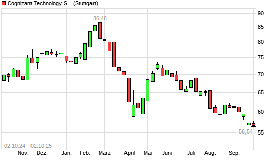 Mit dem Rücksetzer auf 56,40 EUR hat die Cognizant-Aktie (ISIN US1924461023) am 01.10.2025 ein neues 12-Monats-Tief erreicht und damit den Kurs vom 22.09.2025 eingestellt.