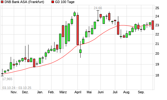 Mit dem Rücksetzer auf 22,51 EUR hat die DNB Bank ASA-Aktie am 02.10.2025 die 100-Tage-Linie nach unten gekreuzt.