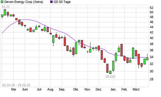 Mit dem Rücksetzer auf 33,99 EUR hat die Devon Energy-Aktie am 28.03.2025 die 50-Tage-Linie nach unten gekreuzt.