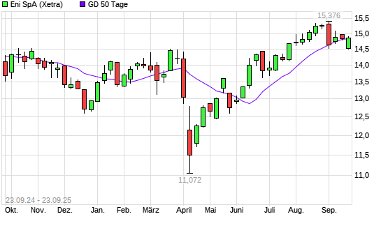 Mit dem Rücksetzer auf 14,61 EUR hat die ENI-Aktie am 22.09.2025 die 50-Tage-Linie nach unten gekreuzt.