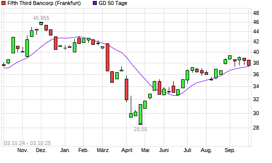 Mit dem Anstieg auf 37,57 EUR hat die Fifth Third Bancorp-Aktie am 02.10.2025 die 50-Tage-Linie nach oben gekreuzt.
