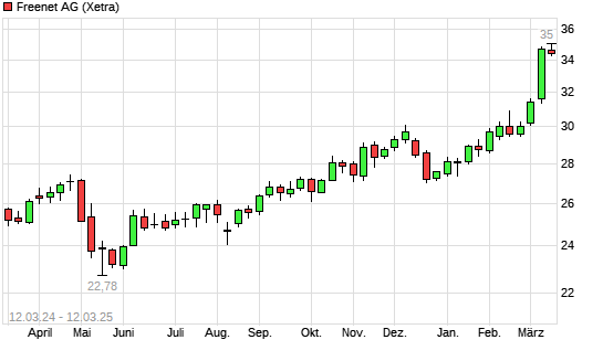 Mit dem Anstieg auf 34,58 EUR hat die Freenet-Aktie (ISIN DE000A0Z2ZZ5) am 11.03.2025 ein neues 10-Jahres-Hoch erreicht und damit den Kurs vom 06.03.2025 eingestellt.