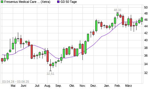 Mit dem Rücksetzer auf 45,01 EUR hat die Fresenius Medical Care-Aktie am 02.04.2025 die 50-Tage-Linie nach unten gekreuzt.