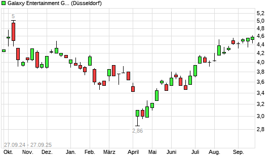 Mit dem Anstieg auf 4,64 EUR hat die Galaxy Entertainment-Aktie (ISIN HK0027032686) am 26.09.2025 ein neues 6-Monats-Hoch erreicht und damit den Kurs vom 07.08.2025 eingestellt.