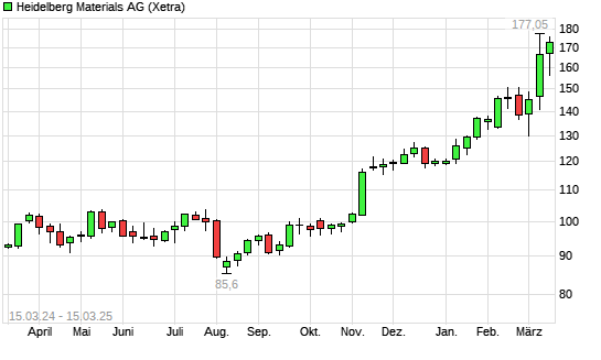 Mit dem Anstieg auf 174,75 EUR hat die Heidelberg Materials-Aktie (ISIN DE0006047004) am 14.03.2025 ein neues All-Time-High erreicht und damit den Kurs vom 12.02.2025 eingestellt.
