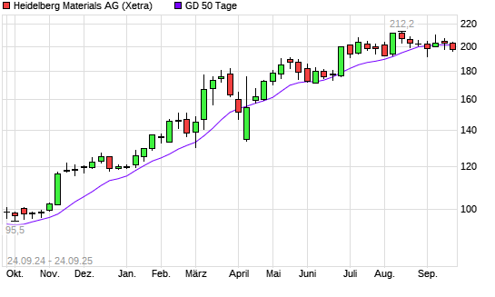 Mit dem Rücksetzer auf 194,95 EUR hat die Heidelberg Materials-Aktie am 23.09.2025 die 50-Tage-Linie nach unten gekreuzt.