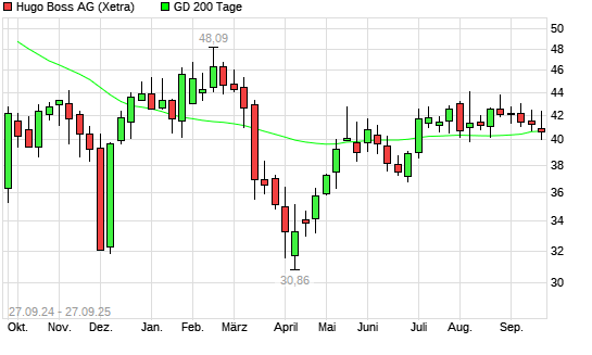 Mit dem Rücksetzer auf 40,42 EUR hat die Hugo Boss-Aktie am 26.09.2025 die 200-Tage-Linie nach unten gekreuzt.