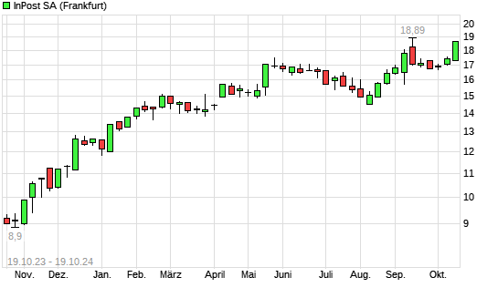 Mit dem Anstieg auf 18,69 EUR hat die InPost-Aktie (ISIN LU2290522684) am 18.10.2024 ein neues 3-Jahres-Hoch erreicht und damit den Kurs vom 09.09.2024 eingestellt.