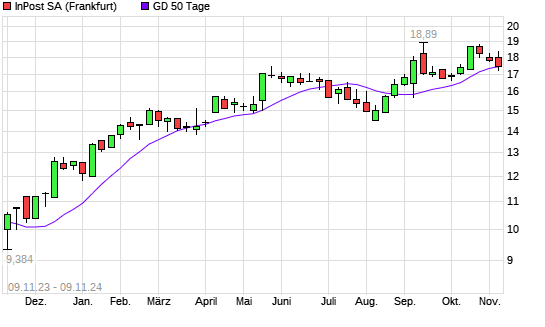 Mit dem Rücksetzer auf 17,43 EUR hat die InPost-Aktie am 08.11.2024 die 50-Tage-Linie nach unten gekreuzt.