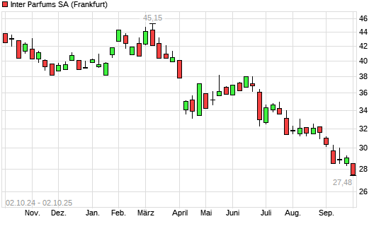 Mit dem Rücksetzer auf 27,58 EUR hat die Inter Parfums-Aktie (ISIN FR0004024222) am 01.10.2025 ein neues 3-Jahres-Tief erreicht und damit den Kurs vom 30.09.2025 eingestellt.