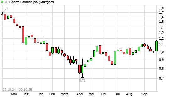 Mit dem Anstieg auf 1,15 EUR hat die JD Sports Fashion-Aktie (ISIN GB00BM8Q5M07) am 02.10.2025 ein neues 6-Monats-Hoch erreicht und damit den Kurs vom 29.08.2025 eingestellt.