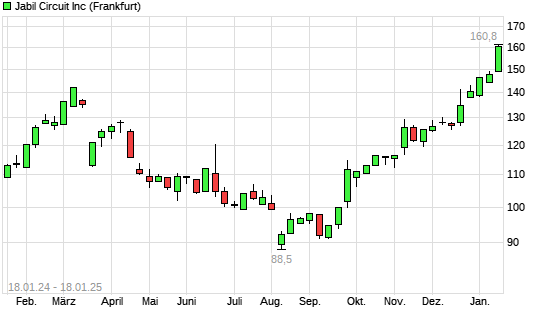 Mit dem Anstieg auf 160,20 EUR hat die Jabil Circuit-Aktie (ISIN US4663131039) am 17.01.2025 ein neues All-Time-High erreicht und damit den Kurs vom 16.01.2025 eingestellt.