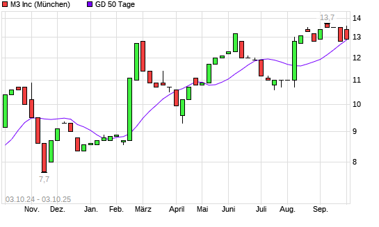 Mit dem Rücksetzer auf 12,60 EUR hat die M3-Aktie am 02.10.2025 die 50-Tage-Linie nach unten gekreuzt.