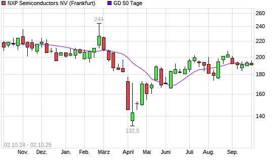 Mit dem Anstieg auf 192,00 EUR hat die NXP Semiconductors-Aktie am 01.10.2025 die 50-Tage-Linie nach oben gekreuzt.Die NXP Semiconductors-Aktie befindet sich seit dem 18.09.2025 im langfristigen ...weiterlesen