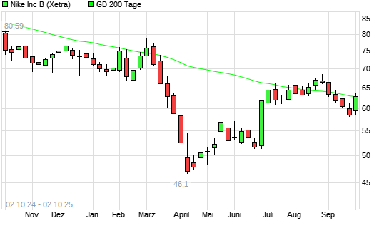 Mit dem Anstieg auf 63,04 EUR hat die Nike-Aktie am 01.10.2025 die 200-Tage-Linie nach oben gekreuzt.
