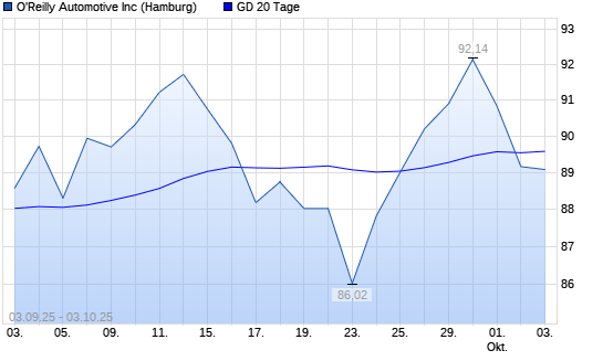 Mit dem Rücksetzer auf 89,36 EUR hat die O'Reilly Automotive-Aktie am 02.10.2025 die 20-Tage-Linie nach unten gekreuzt.