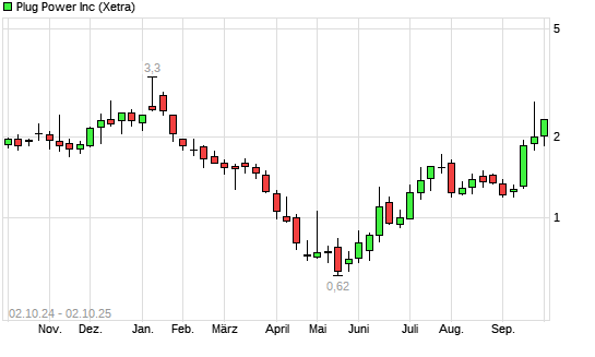 Mit dem Anstieg auf 2,47 EUR hat die Plug Power-Aktie (ISIN US72919P2020) am 01.10.2025 ein neues 6-Monats-Hoch erreicht und damit den Kurs vom 22.09.2025 eingestellt.