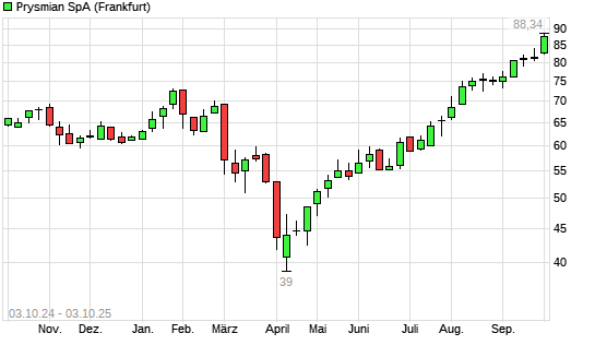 Mit dem Anstieg auf 87,50 EUR hat die Prysmian-Aktie (ISIN IT0004176001) am 02.10.2025 ein neues All-Time-High erreicht und damit den Kurs vom 30.09.2025 eingestellt.