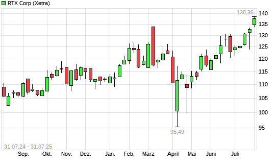 Mit dem Anstieg auf 138,00 EUR hat die Raytheon Technologies-Aktie (ISIN US75513E1010) am 30.07.2025 ein neues All-Time-High erreicht und damit den Kurs vom 29.07.2025 eingestellt.