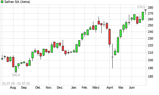 Mit dem Anstieg auf 276,80 EUR hat die Safran-Aktie (ISIN FR0000073272) am 30.06.2025 ein neues All-Time-High erreicht und damit den Kurs vom 27.06.2025 eingestellt.