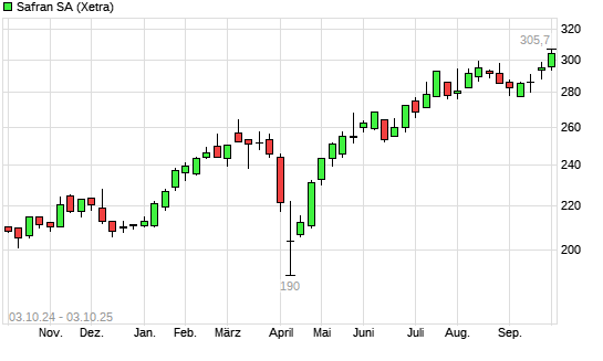 Mit dem Anstieg auf 303,50 EUR hat die Safran-Aktie (ISIN FR0000073272) am 02.10.2025 ein neues All-Time-High erreicht und damit den Kurs vom 30.09.2025 eingestellt.