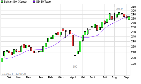 Mit dem Anstieg auf 285,00 EUR hat die Safran-Aktie am 12.09.2025 die 50-Tage-Linie nach oben gekreuzt.