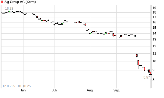 Mit dem Rücksetzer auf 8,55 EUR hat die Sig Combibloc Services-Aktie (ISIN CH0435377954) am 02.10.2025 ein neues All-Time-Low erreicht und damit den Kurs vom 01.10.2025 eingestellt.