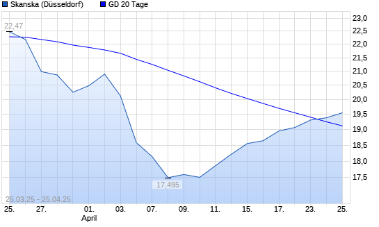 Mit dem Rücksetzer auf 18,96 EUR hat die Skanska-Aktie am 24.04.2025 die 20-Tage-Linie nach unten gekreuzt.