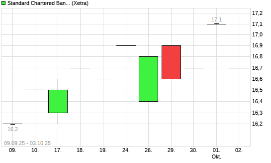 Mit dem Anstieg auf 16,90 EUR hat die Standard Chartered Bank-Aktie (ISIN GB0004082847) am 02.10.2025 ein neues 10-Jahres-Hoch erreicht und damit den Kurs vom 12.08.2025 eingestellt.